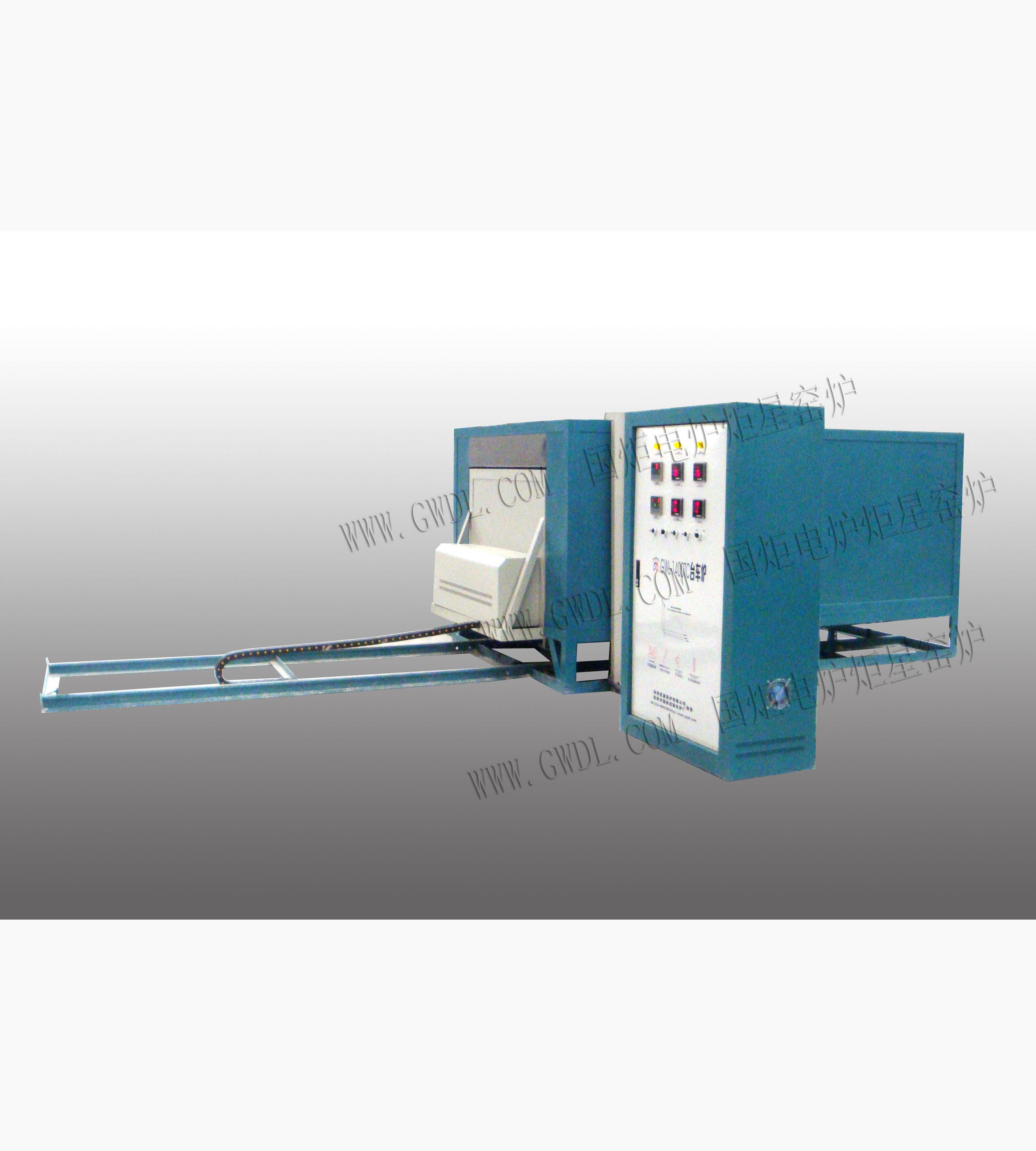 GWL-STCY系列1200度一體爐門臺車爐如圖所示,集控制系統(tǒng)與爐膛為分體。爐襯使用真空成型高純氧化鋁聚輕材料。